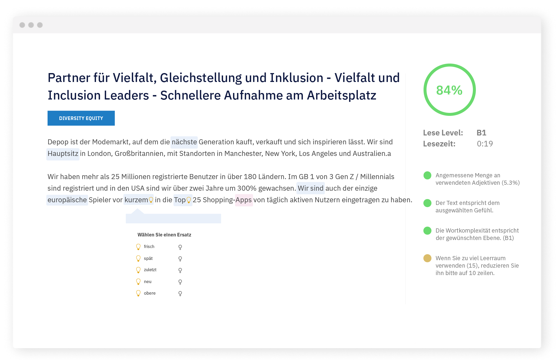 Textmetrics ist der weltweit führende smarte Schreibassistent, der Ihnen hilft, umfassende Stellenanzeigen zu schreiben. Unsere Plattform liest mit, während Sie schreiben, analysiert Ihre Stellenanzeigen und macht Verbesserungsvorschläge. Vermeiden Sie geschlechtsspezifische Voreingenommenheit, schreiben Sie inklusiv und SEO-optimieren Sie Ihre Stellenanzeigen für Google for Jobs. Das Wichtigste: Stellen Sie sicher, dass Ihr Text auf dem verständlichen Sprachniveau B1 geschrieben ist.