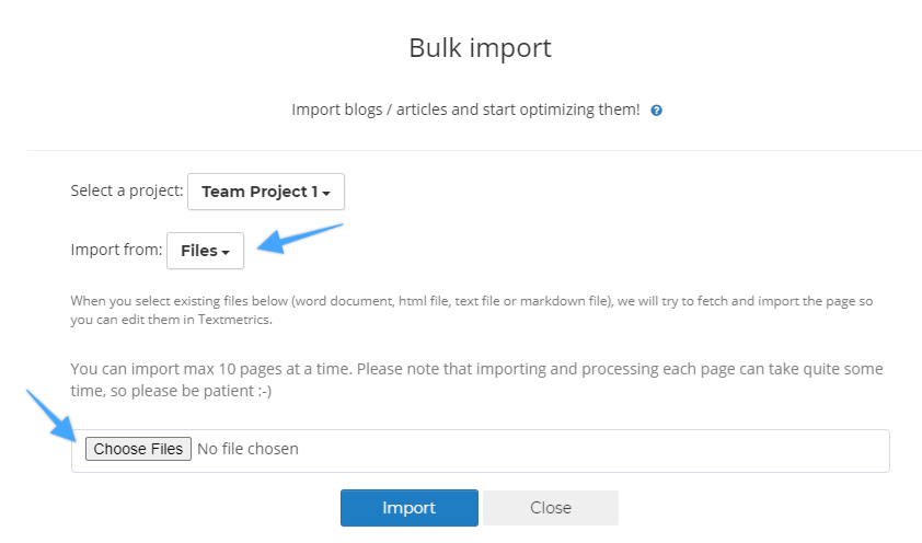 If you want to load multiple files, you can use the + icon at the top of the page. There are several options in this drop-down menu. Click Import Page to open the window shown below. Select one of your projects to work in and click Choose Files to browse your computer for the text files you want to optimize.