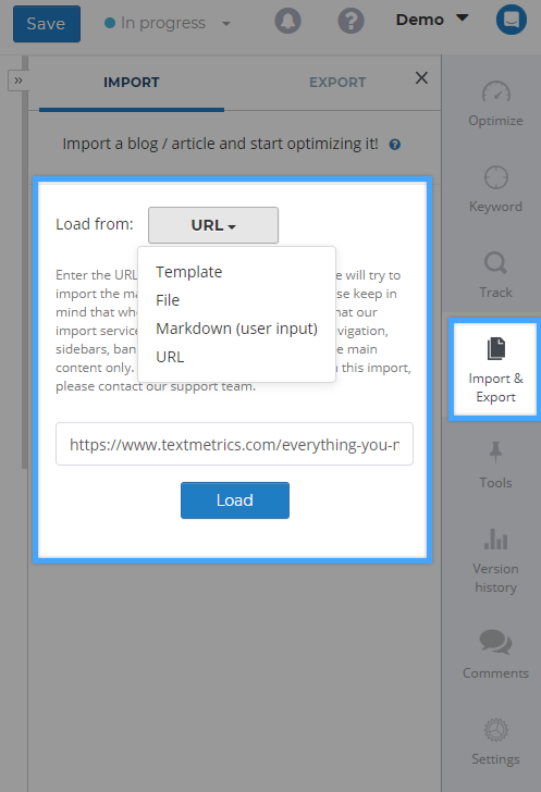 In addition to optimizing any new content you want to publish, Textmetrics also gives you the opportunity to check the quality of your existing web pages. There are several ways to import your content into Textmetrics – watch the video below or keep reading for a step-by-step instruction.