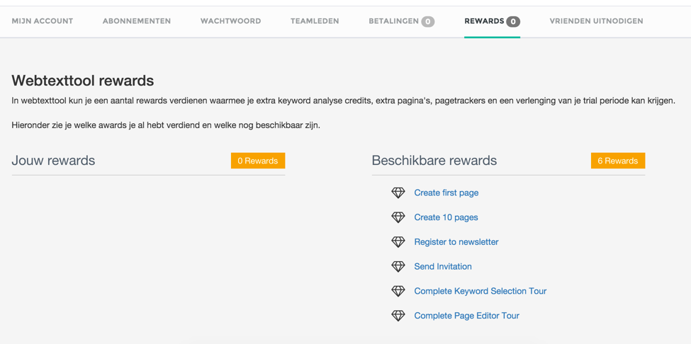 Geheel nieuw is de mogelijkheid om Rewards te verdienen. Gebruikers kunnen rewards, in de vorm van keyword credits, pagina’s of projecten, verdienen wanneer zij Textmetrics actief gebruiken of vrienden uitnodigen voor Textmetrics. De te verdienen rewards of een overzicht van reeds verdiende rewards vind je in het onderdeel ‘mijn account’.
