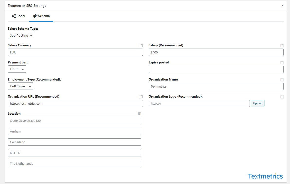 Now, this is where Textmetrics’ latest WordPress update will benefit employers. The WordPress plugin will (automatically) generate Schema.org structured data for the “Job Posting” type. In the plugin settings, you can provide default Organization data (i.e. name, logo or location data). This new feature makes it easier for employers to index their job postings on Google for Jobs.