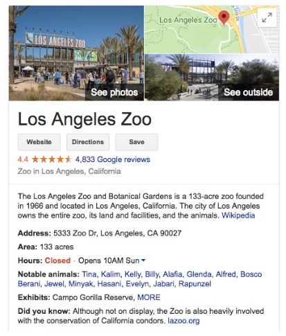 A desktop search for the Los Angeles Zoo results in general information about the zoo, including ’notable animals’ like the gorillas Rapunzel and Jabari, orangutan Berani, and Alfred the seal.